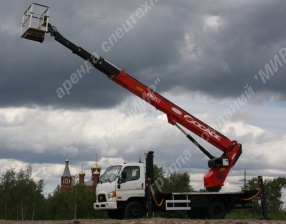 АГП 18.04 - автогидроподъёмник с длиной вылета стрелы 18 метров позволит вам решать задачи монтажных высотных работ. Телескопическая автовышка в аренду недорого, заказать услуги мехруки вы можете по телефону. Лучшая цена аренды!